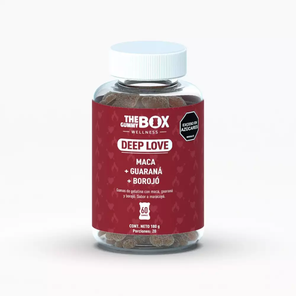 Déjate llevar por la energía y la pasión natural de Deep Love de The Gummy Box, una fusión irresistible de maca, guaraná y borojó diseñada para despertar tus sentidos y elevar tu vitalidad día a día. Estas deliciosas gomas de gelatina con sabor a maracuyá son el impulso perfecto para quienes buscan mejorar su desempeño físico, mental y emocional de forma deliciosa y práctica.